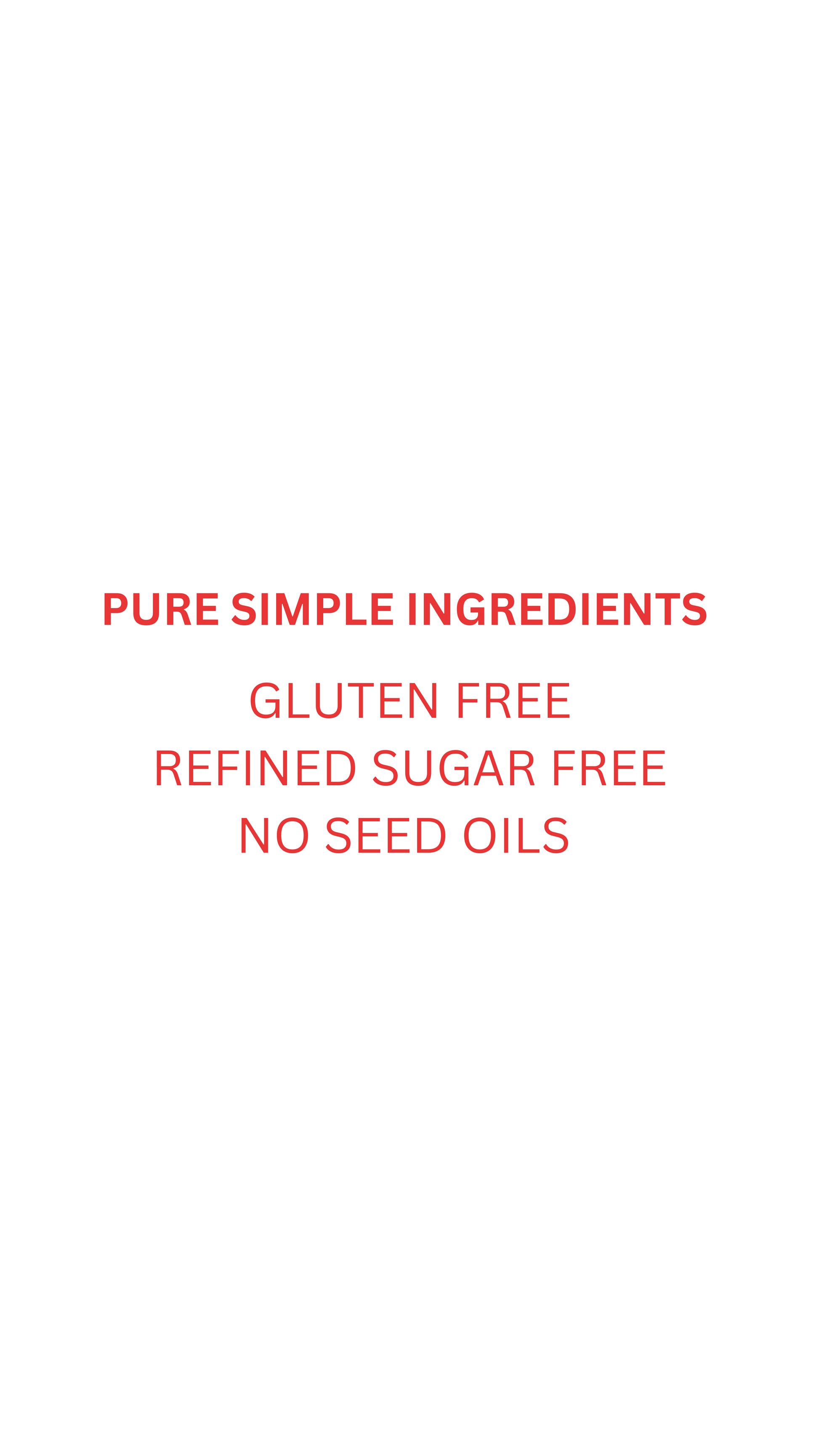 Always gluten free, refine sugar free, no artificial sweeteners, no artificial colors, and no seed oils.